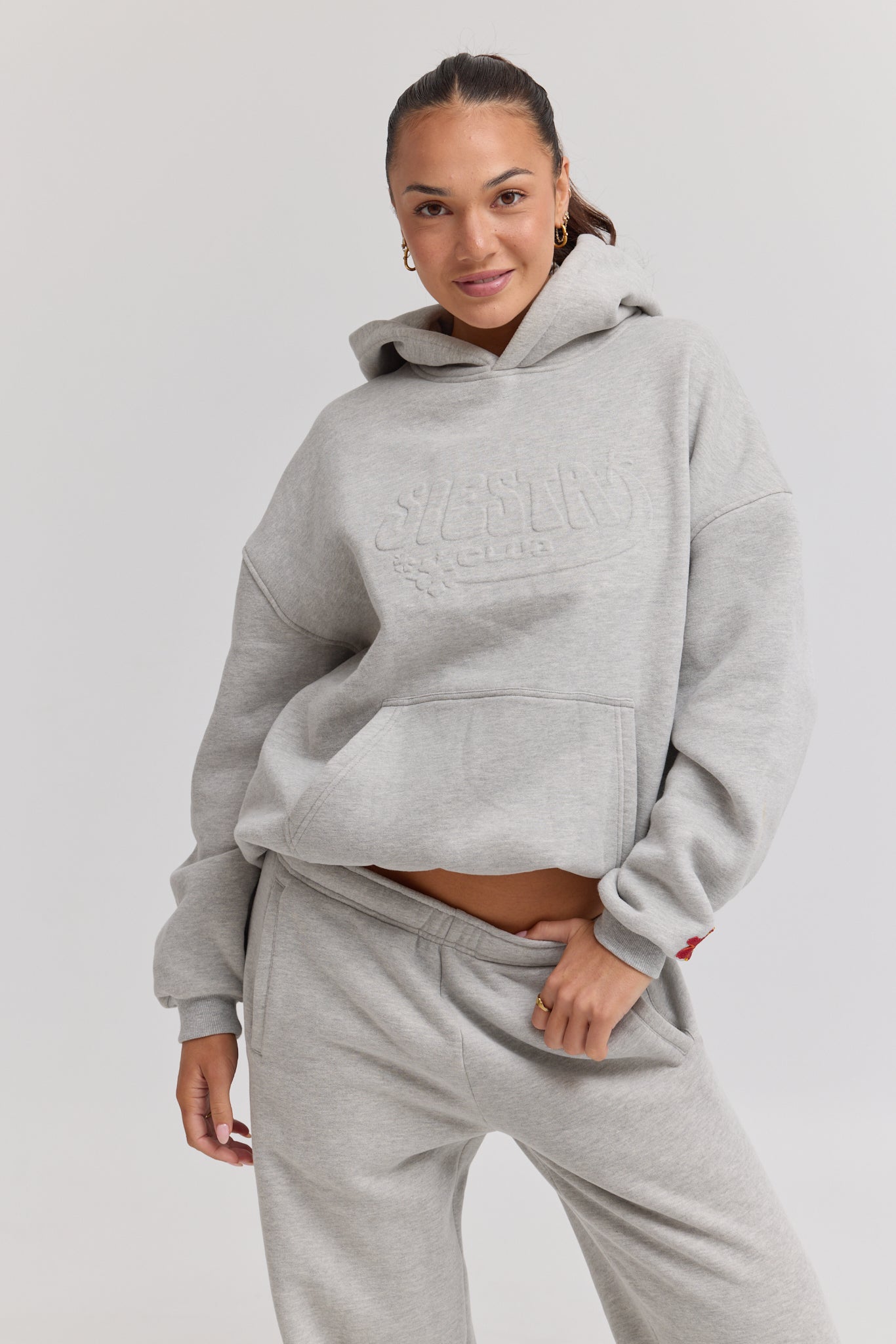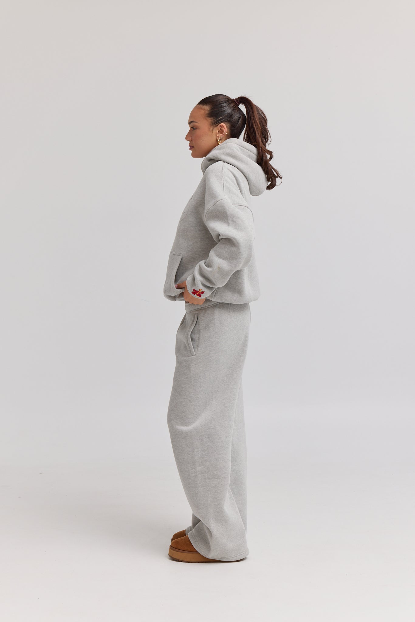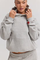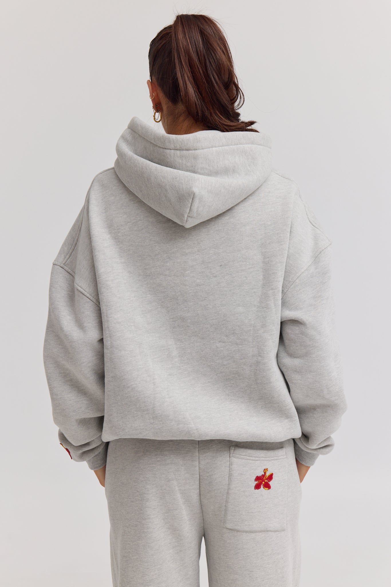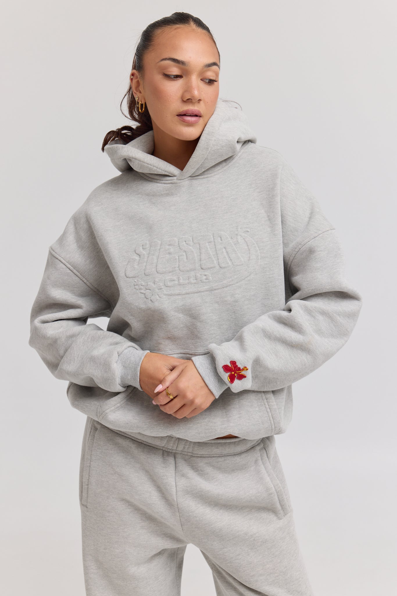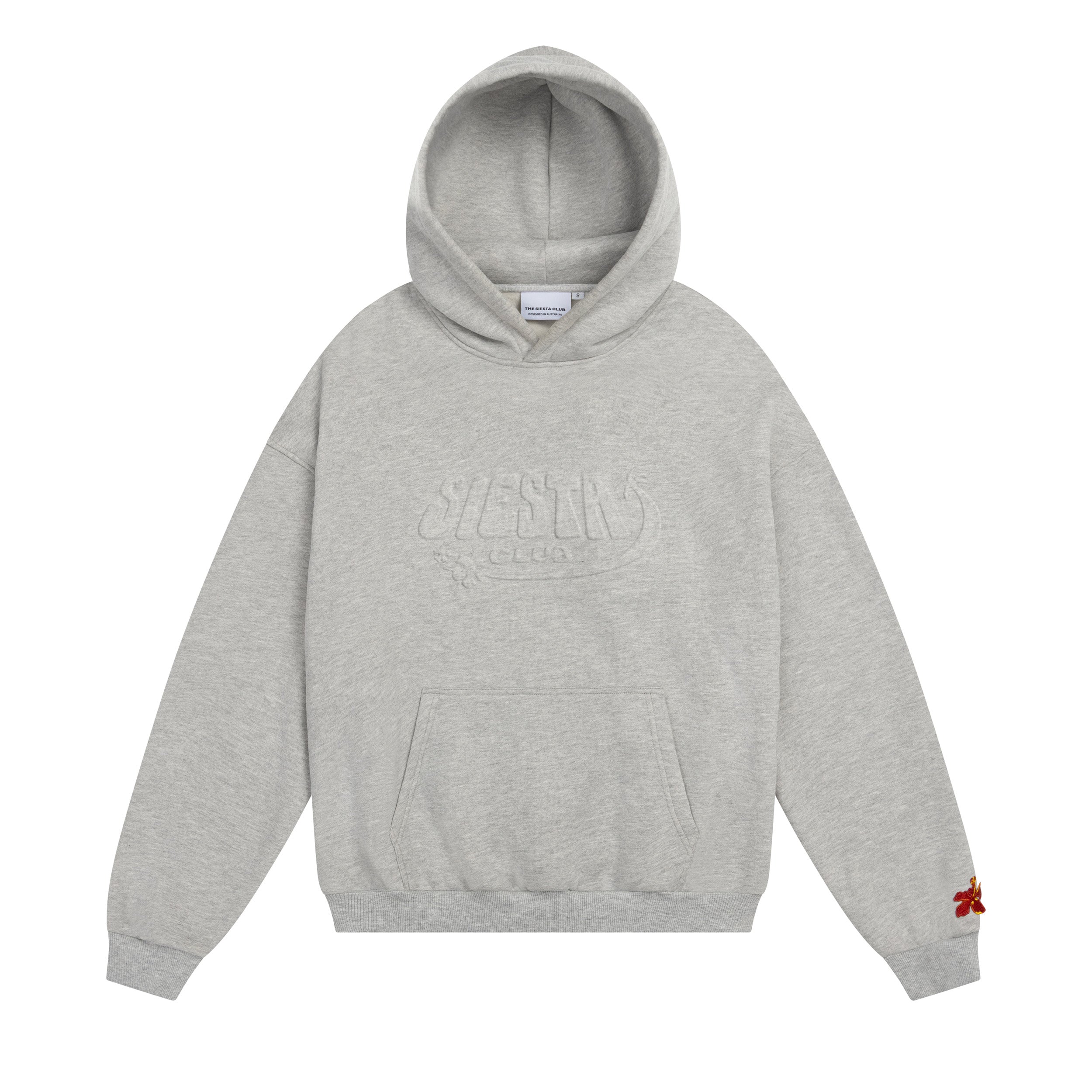 The Palma Hoodie in deep grey is crafted from premium heavy weight blended cotton. Featuring a tonal embossed logo on the chest and a subtle red hibiscus flower detail on the sleeve.