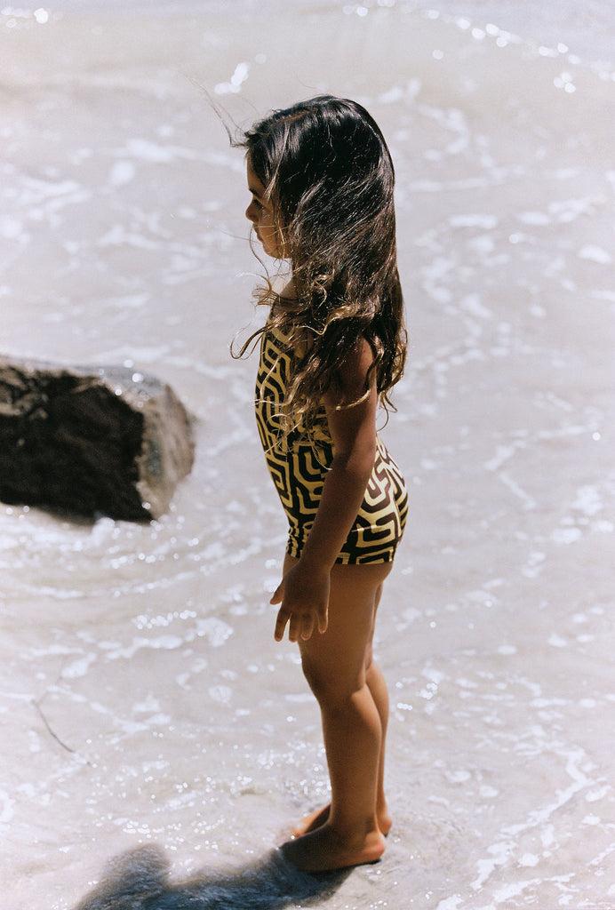 Let your little ocean explorer play in style and comfort with our new mini range. Featuring a maze print in golden tan and brown, this sunsuit is perfect for beach days or poolside fun. The suit offers full coverage with a snug, comfortable fit and adjustable straps for growing swimmers.