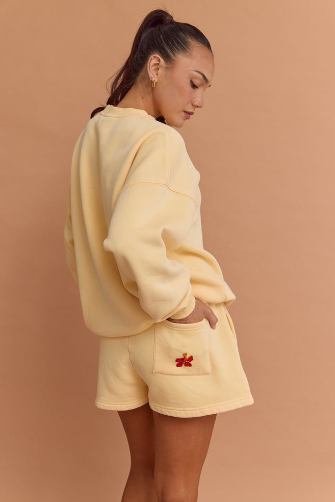 Meet our staple shorts. Crafted with our premium cotton fabric, lined with soft fleece. Style with our yellow staple crewneck to complete the look.